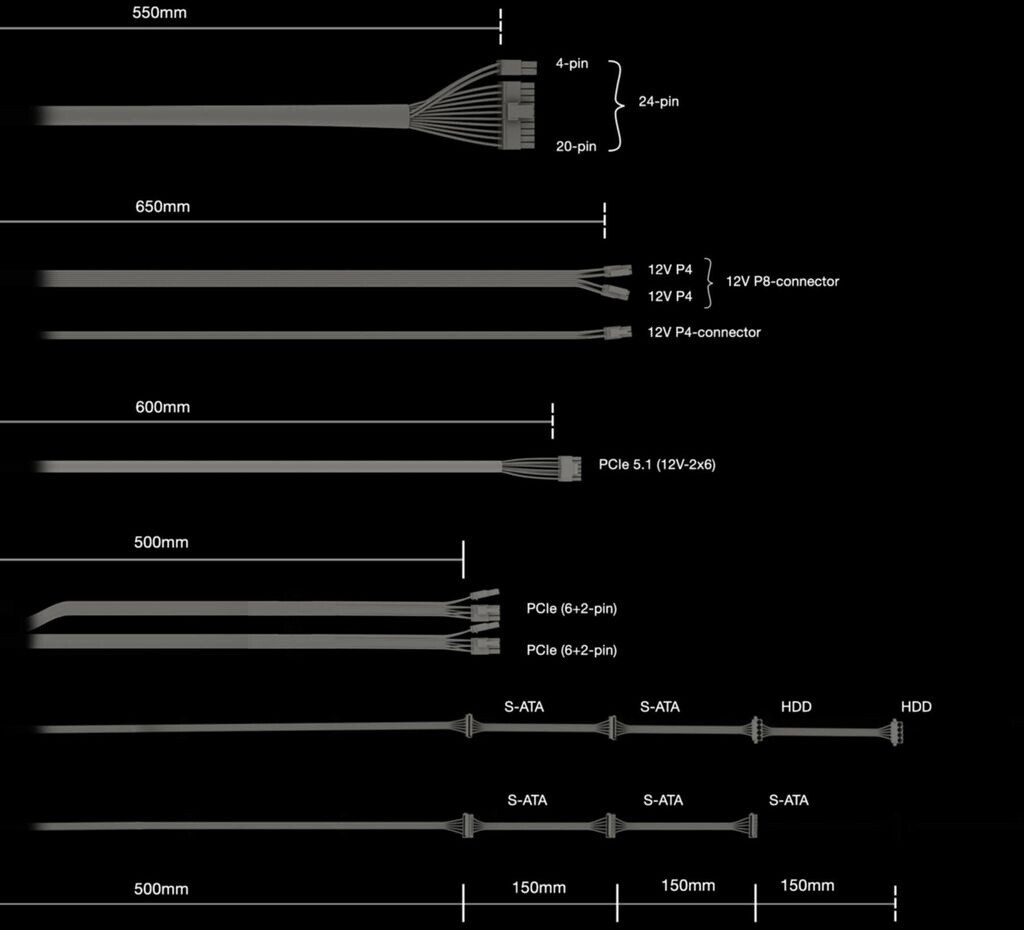 | Anschlüsse | 1x 24-Pin-ATX12V-2.x, 1x 4+4-Pin-12V, 1x 4-Pin-12V, 2x 4-Pin-5,25", 2x 6+2-Pin-Grafik, 1x 12+4 Pin (12V-2x6), 5x 15-Pin-SATA | ||