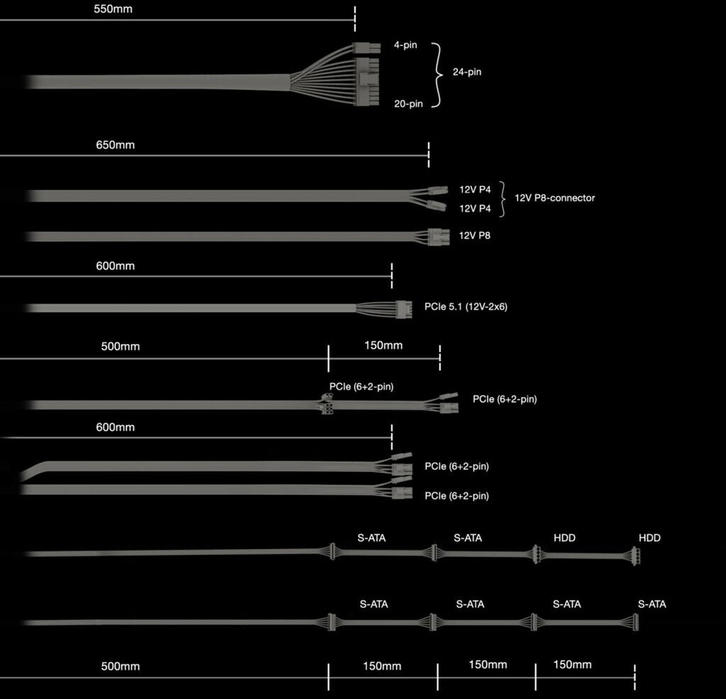 | Anschlüsse | 1x 24-Pin-ATX12V-2.x, 1x 4+4-Pin-12V, 1x 4-Pin-12V, 2x 4-Pin-5,25", 4x 6+2-Pin-Grafik, 1x 8-Pin-12V, 1x 12+4 Pin (12V-2x6), 6x 15-Pin-SATA | ||